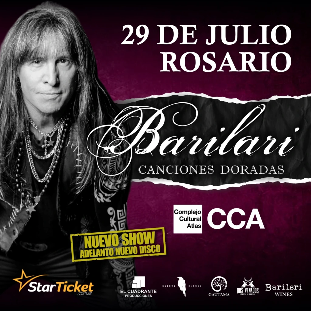 ADRIÁN BARILARI, conocido por ser el vocalista de la banda Rata Blanca, sale de gira una vez más por nuestro país con su disco solista “Canciones doradas” y suma nuevas canciones al repertorio de lo que será un show inolvidable en la ciudad de Rosario.