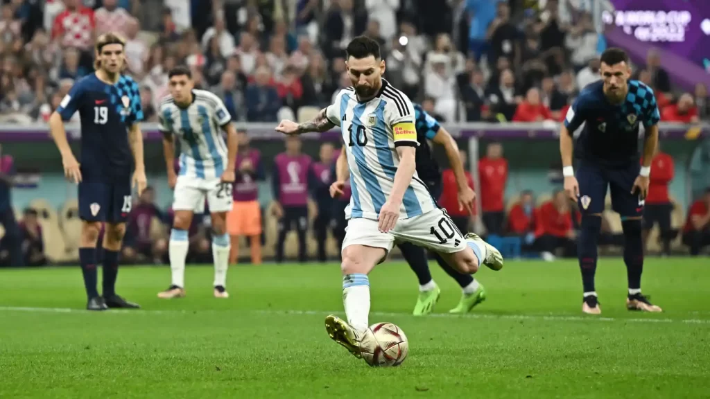 Pero el siguiente contraataque de Argentina fue mortal; pase de Enzo Fernández a Julián Álvarez que fue una delicia, superó al arquero, de emboquillada, que lo derriba y despejó la defensa pero el árbitro retrotrae la acción y cobra penal que Lio Messi cambió por gol con una ejecución inatajable a los 34 minutos.