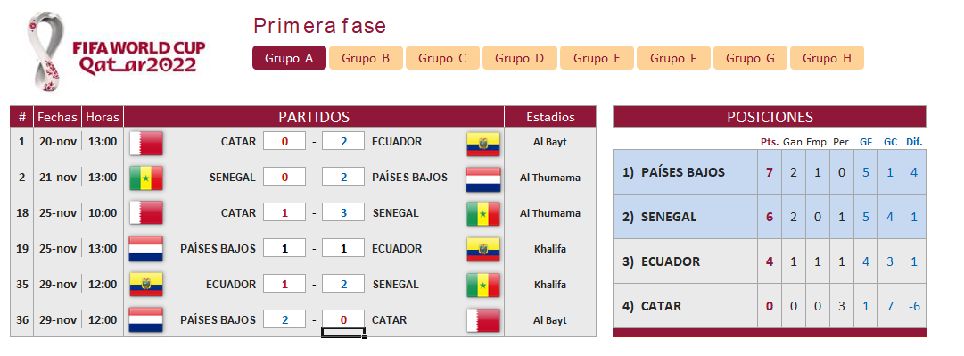 En el primer turno se definió el grupo A quedando Países bajos y Senegal primero y segundo respectivamente, obteniendo así el pase a los octavos de final por encima de Ecuador y la selección anfitriona que ya estaba eliminada.