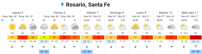Según el Servicio Meteorológico Nacional (SMN), las temperaturas extremas se mantendrán en Rosario durante varios días. Las máximas oscilarán entre los 35 y los 36 grados aunque para el próximo miércoles la situación podría ser todavía más complicada y alcanzar los 40ºC.