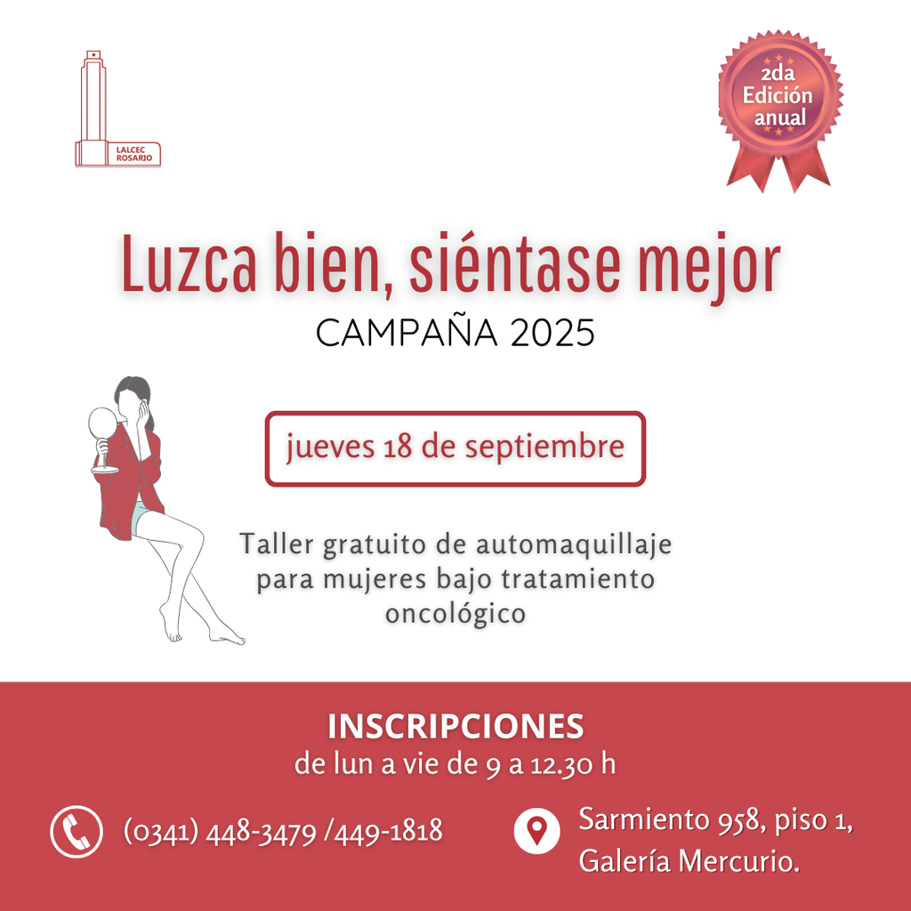 LALCEC Rosario abrirá nuevamente sus puertas para llevar adelante la segunda edición anual del taller gratuito “Luzca bien, siéntase mejor”, un programa internacional que busca fortalecer la autoestima de mujeres que atraviesan tratamientos oncológicos. La jornada se realizará el jueves 18 de septiembre en la sede ubicada en Sarmiento 958, Galería Mercurio, piso 1, y está destinada a aquellas mujeres que aún no hayan participado previamente.