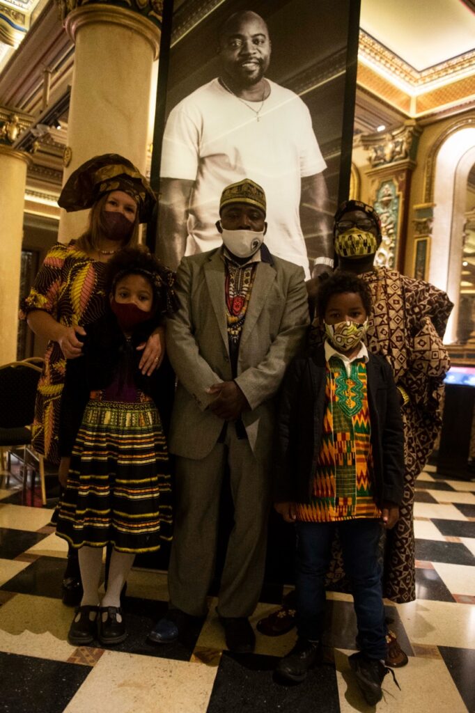 En esta última imagen podemos observar a la familia y detrás está instalado un cuadro con el Presidente de la Asociación Africana de Rosario, donde ya es no solo reconocido sino también muy querido por los ciudadanos. Un valiente que fundó La Asociación en nuestra ciudad para poder generar puestos de trabajo y así ayudar a quienes mas lo necesitan.